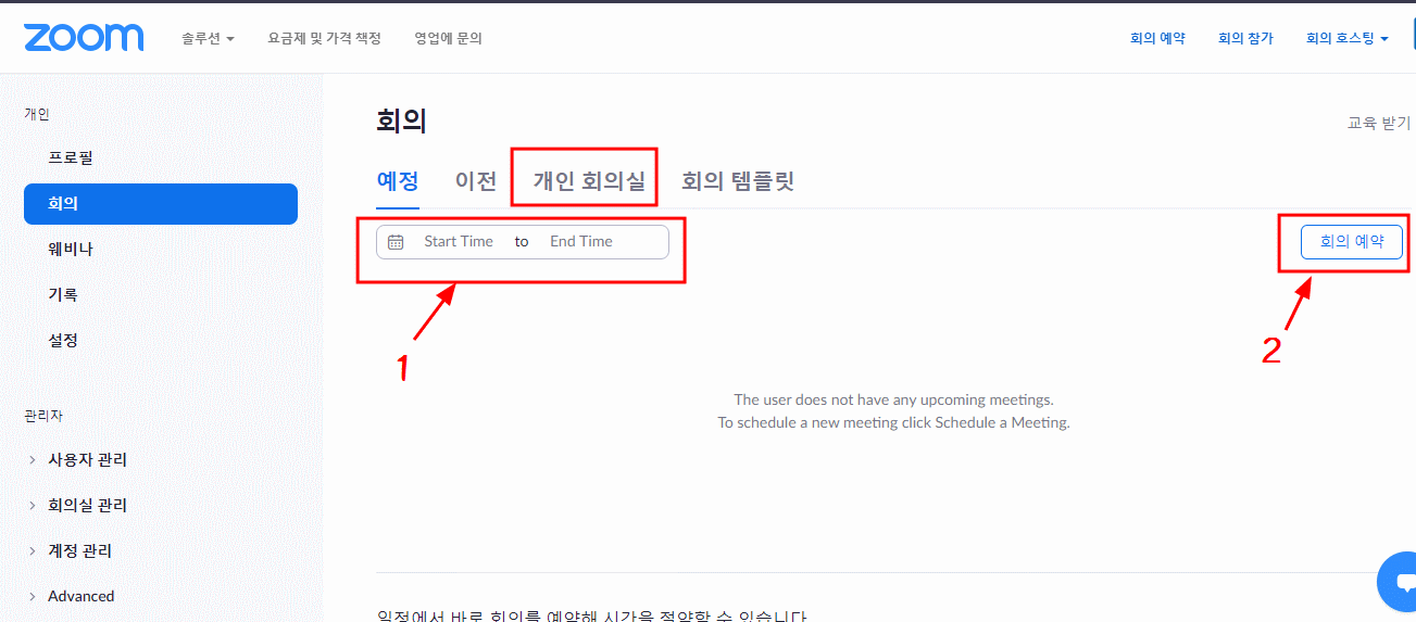 줌 로그인 하면 초기 화면이다. 예정 탭에서 1번의 경우 시간을 정해 2번으로 회의를 예약 가능하다. 즉시 회의를 시작하려면 개인 회의실을 클릭하면 된다. 방송을 컨셉으로 하는 것이 아니다 보니 용어 자체가 업무 중심의 회의임을 알 수 있다. 한 명이 메인이 돼 구성원이 참여하는 방식으로 회의도 많겠지만 주로 교육 목적으로 진행하는 경우가 많겠다.
